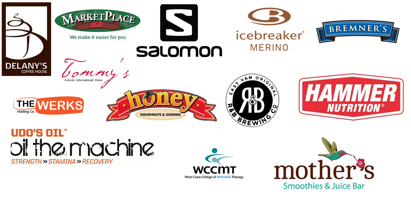 We have fantastic sponsors! A big thank you to Salomon, Icebreaker, Marketplace IGA, Hammer Nutrition, Tommy’s Catering, Bremner’s Foods, R&B Brewing Co., Udo’s Oil, West Coast College of Massage Therapy, The Werks Hosting Co., Honey Doughnuts and Goodies, Delany’s Coffee…